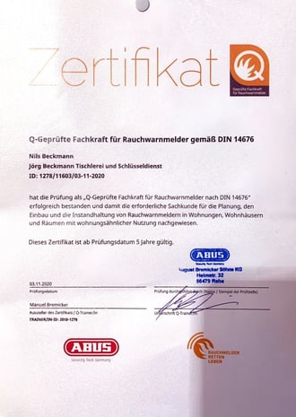 Als "Q-Geprüfte Fachkraft für Rauchwarnmelder gemäß DIN 14676" haben wir die erforderliche Sachkunde für die Planung, den Einbau und die Instandhaltung von Rauchwarnmeldern in Wohnungen,